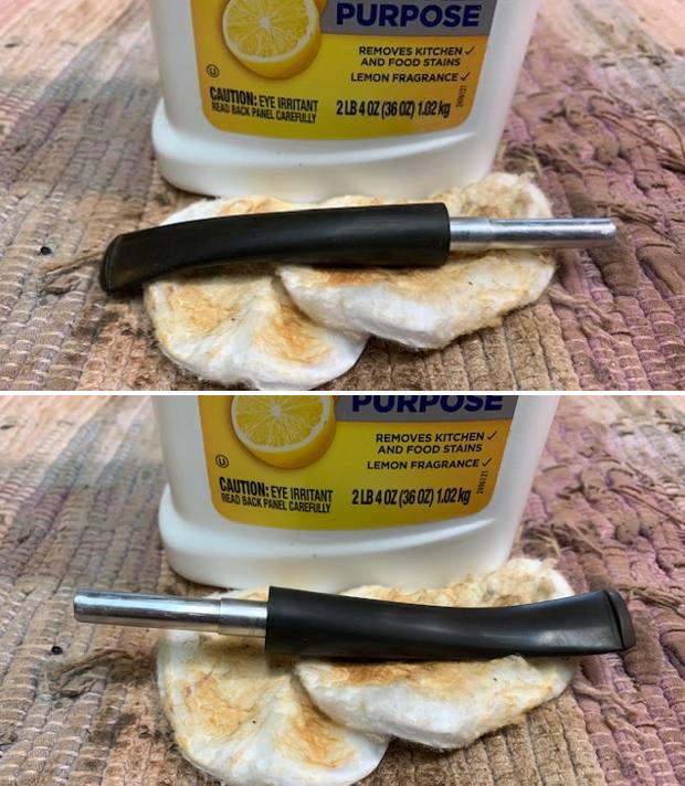I used a brass bristle brush to scrub off the rim top rustication. It loosened the grit. I wiped the rim top down with some undiluted Murphy’s Oil Soap on a cotton pad and used the brush again. The rim top looked very good at this point.