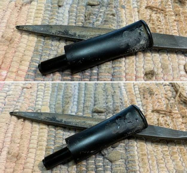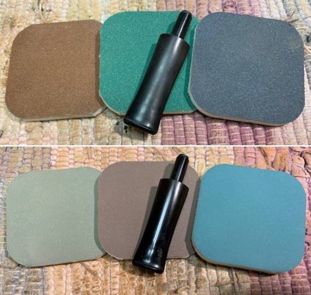 Once it had hardened I flattened the repairs with a file. I sanded smooth with 220 grit sandpaper to blend them into the surrounding surface of the vulcanite. I then sanded it with 400 grit wet dry sandpaper to further blend it into the vulcanite.