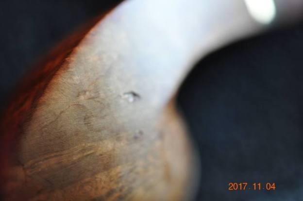 I repaired the chip out of the right underside of the bowl with briar dust and clear CA glue. I filled in the chip with the clear glue and pressed briar dust into it. Once it cured I sanded it smooth to blend it into the surface.