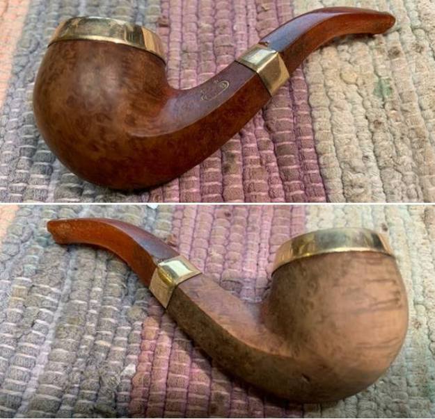 I turned to first to a couple of the blogs that I have written on the restoration of G.F.B. pipes in the past. I reread them and have included a link to one of them below. I was able to identify that the G.F.B. stamp stood for Genuine French Briar (https://rebornpipes.com/2013/11/21/restoring-an-older-gfb-three-star-horn-stem-bent-bulldog/). I have included a catalogue page on the brand below for you to see. The description fits the rim cap and ferrule of mine. It says “Beautiful Rolled Gold Plate Mountings and Real Amber Bits.”