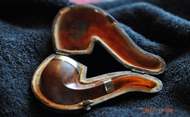 Don’t you want to know what is inside of this case? Do you want to compare it with the other unsmoked on I called its “Big Brother”? Well… I will get there. Jeff opened the case to show us what the pipe looked like inside. The lining of the case was far more worn and had a orange colour to it. It also had the G.F.B. stamp on the inside of the cover. The rolled gold cap and ferrule were not ornate or filigreed like the previous one. It was definitely a lower grade model.