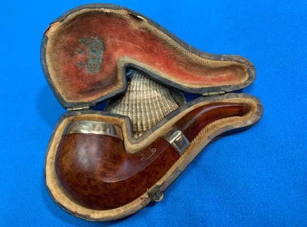 Manhattan Briar Pipe Co. had started operations in 1905 in Jersey City, New Jersey, having taken on a lease for a ten year period in 1905, and maintained a factory at Marion, New Jersey, where the pipes were made. By 1913, former American Tobacco pipe department chair John Glossinger was the president of Manhattan Briar Pipe Company, and began a significant advertising push for high grade pipes, using the slogan “Don’t spoil good tobacco by using a poor pipe”. It appears from cases having appeared on the estate market that Manhattan also sold meerschaum pipes, most likely rebranded articles originally made by European craftsmen.