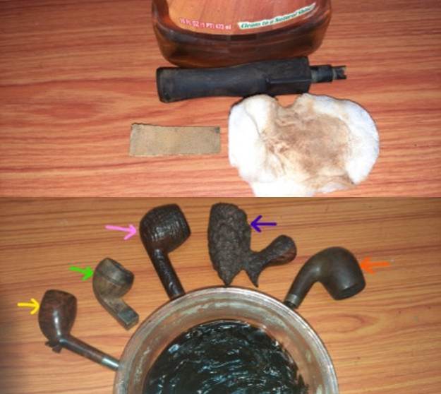I started the restoration of this old timer by immersing the stem in to the deoxidizer solution from Mark Hoover. Before dunking the stem in to the solution, I ran a couple of pipe cleaners dipped in alcohol through the previously cleaned airway to remove the dust that may have accumulated over the last three years. I scrubbed the stem surface with a piece of 220 grit sandpaper to loosen up the oxidation from the surface and further cleaned it with Murphy’s Oil soap on a cotton swab. Once the surface was cleaned, I dunked the stem in to the deoxidizer solution along with the other pipe stems that are in queue for restoration and indicated with a green arrow. The stem is allowed to soak in the solution overnight giving ample time for the solution to pull much of the oxidation to the surface.