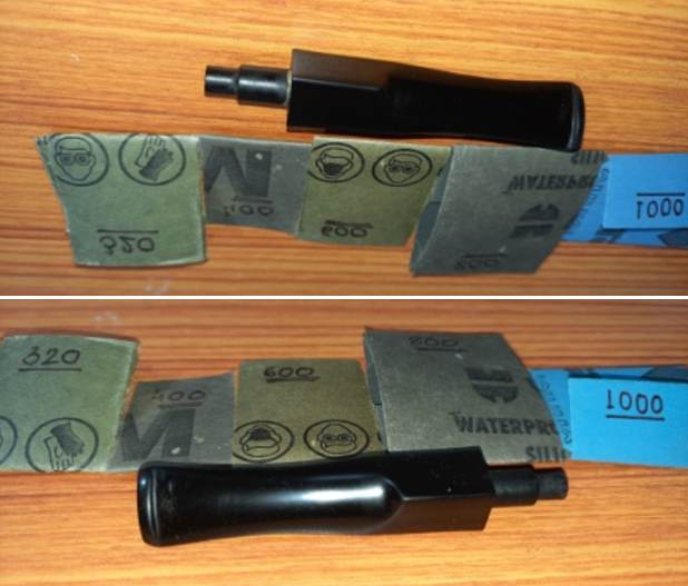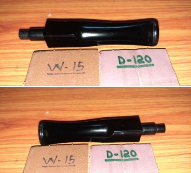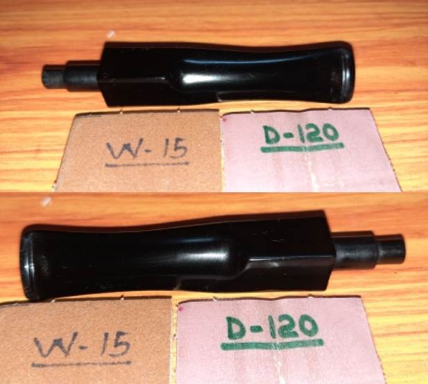 The stem repairs had hardened considerably over the past 18 odd hours. I used a flat head needle file to sand the patch and achieve a rough match with the rest of the stem surface. I further evened out the patch with a folded piece of 220 grit sand paper. Similarly, I shaped the rebuilt tenon for perfect seating into the mortise. For a better blending, I further sanded the entire stem with 320 followed by 400, 600, 800 and 1000 grit sand paper. This helps to reduce the scratch marks left behind by the more abrasive 220 grit paper. I rubbed a small quantity of EVO to rehydrate the stem and set it aside.
