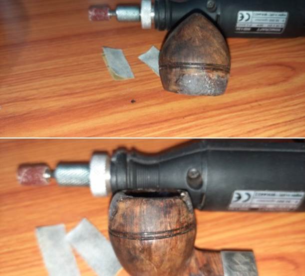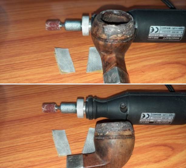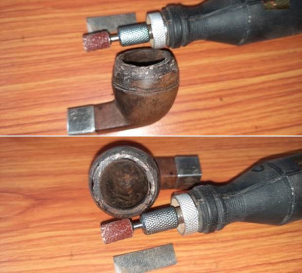 The J B Weld coat had hardened considerably by next day evening when I got around to working on the pipe. I mounted a sanding drum on to my hand held rotary tool and after setting the speed to half of the full RPM, I sanded the excess coat from the chamber walls. To further fine tune and keep the coat to a minimum thickness, I further sanded with a 150 grit sand paper till I had a coat thickness that was just sufficient to protect the briar underneath. Here is how the chamber appeared at this stage.