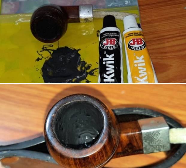 With the PoA ready, I mixed the two part epoxy. J B Weld is a two-part epoxy Cold Weld in two tubes; hardener and steel which are mixed in two equal parts (ratio of 1:1) with hardening time of 5-6 minutes and complete curing time of 6-8 hours. I poured the contents of the two tubes and mixed it well. I inserted a petroleum jelly coated regular pipe cleaner through the draught hole to prevent it from getting blocked due to the J B Weld mix. I applied this mix, as evenly as possible, over the entire chamber wall surface and worked fast to ensure an even coat over the chamber walls before the weld could harden. I set the stummel aside for the application to harden and cure overnight.