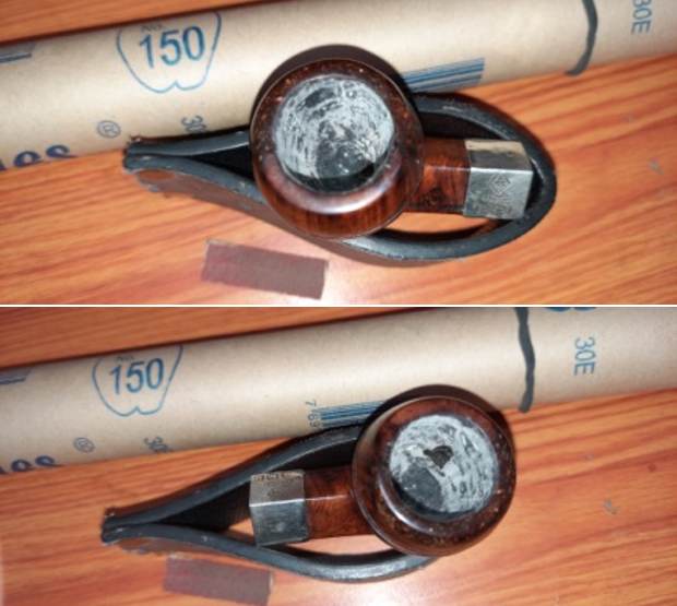 To even out the rim top surface, I topped the rim surface on a piece of 220 grit sandpaper till I had achieved an even a rim surface as was achievable while maintaining the shape and proportions of the stummel. A few light spots are seen where the glue did not mix with the briar dust forming an air pocket which got exposed during the sanding process.