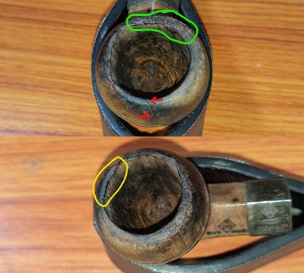 The rim top surface is where the maximum damage is on this pipe. The rim edges have been subjected to a heavy knocking all around but moreover in the 6 and 7 o’clock direction (encircled in green). A small crack is seen extending over the rim surface down towards the twin rings in 12 o’clock direction and is indicated with red arrows. This crack extends inside the chamber and the same is encircled in red. The rim has thinned out considerably towards the front between 12 and 1 o’clock direction (encircled in yellow). There is a chunk of briar that is missing from 3 o’clock direction either due to knocking against a hard edge or could be due to charring or combination of both. This damaged portion of the rim is encircled in pastel blue. The chamber walls show webbing of heat lines/ fissures. These repairs to the rim surface damage will be the most challenging part of the resurrection of this pipe.