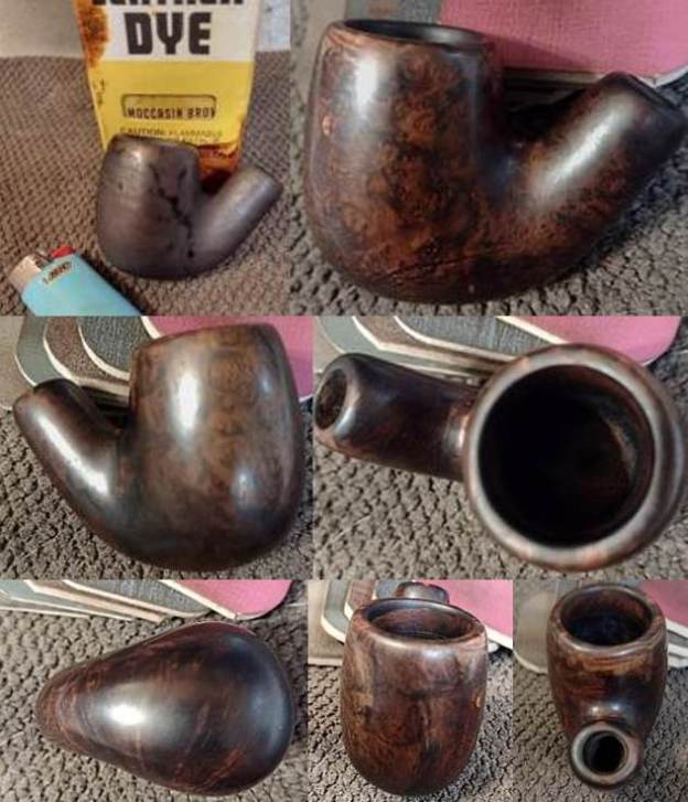 My Fiebing’s Dark Brown leather dye was evaporated from long disuse, so I fell back on the Moccasin Brown for the stain. With a flick of my Bic, I achieved an excellent flambé effect. After a cool-off, I got rid of the char and gave the briar a shine with micro mesh from 6000-12000. As is apparent in the following shots, some areas were too light, although not all of the pics show just how light. I spot stained under the rim, the difficult to reach space on the back side of the bowl in the curve of the shank and most of the right and front sides. Okay-okay, I revise “some areas” to more or less all! Re-flambéeing the corrected places (I know that wasn’t a word until I added it to my MS Word dictionary), and another four-pad micro mesh were easy. I didn’t bother to memorialize with still more photos the steps that should have been unnecessary. I think 75 will be quite sufficient. Despite repeated staining of the small spot bordering the left side and right front views, I made it a tad better but not gone.