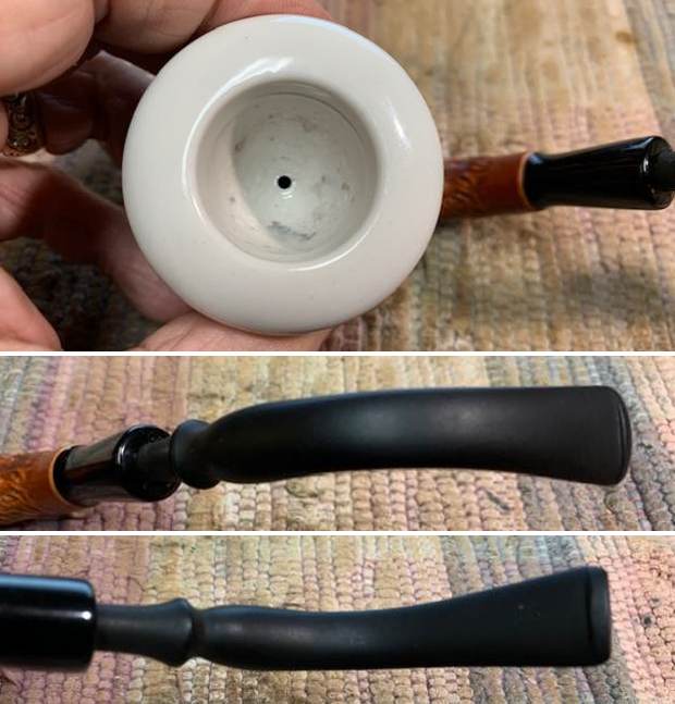 With refurbishing the final moment when all the pieces come back together is the tell all! I put the pipe back together and buffed the gourd and the stem with Blue Diamond. I gave the gourd and the stem multiple coats of carnauba wax. I buffed the those parts with a clean buffing pad to raise the shine. I hand buffed it with a microfiber cloth to deepen the shine. I put the cup back in the gourd and hand buffed the finished pipe. It is fun to see what the polished bowl looks like with the smooth finish and the black fancy vulcanite stem. This Small Gourd Calabash with a Porcelain Bowl is light wight and it is ready for you to load up a tobacco of preference and enjoy breaking it in for yourself. Have a look at it in the photos below. The dimensions are Length: 7 inches, Height: 2 ¾ inches, Outside diameter of the bowl (cup): 2 inches, Chamber diameter: 1 inch. The weight of the pipe is 57 grams/2.01 ounces. This is one that will go on the American Pipemakers section of the rebornpipes online store shortly. Thanks to each of you who are reading this blog. Remember we are not pipe owners; we are pipemen and women who hold our pipes in trust until they pass on into the trust of the next generation.