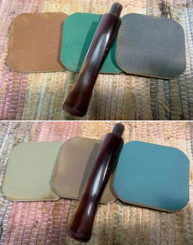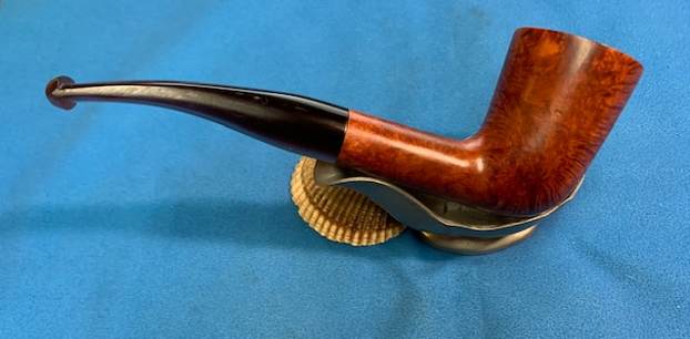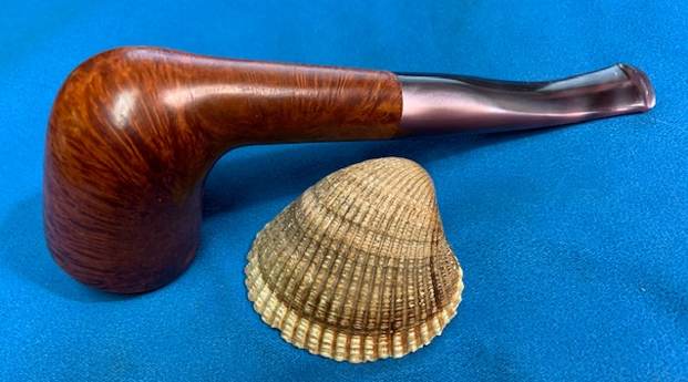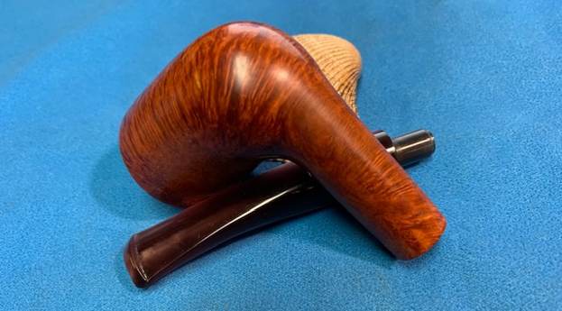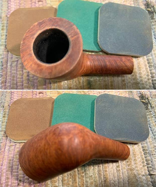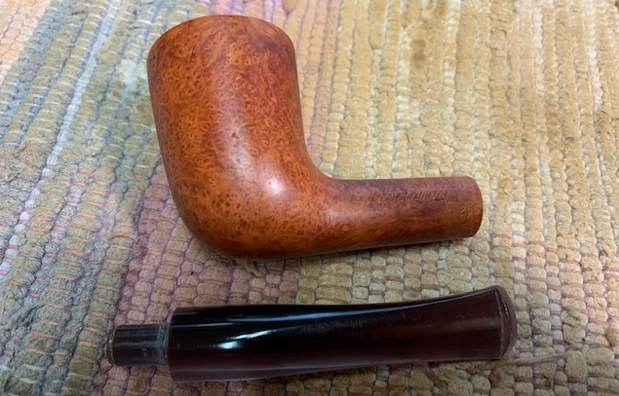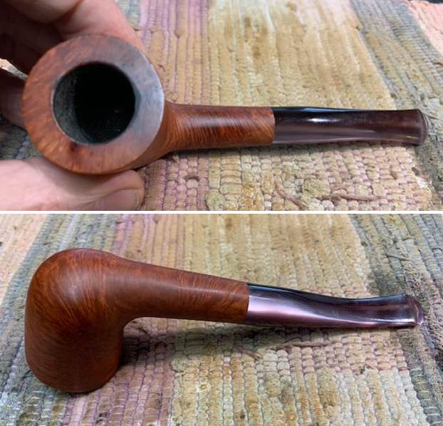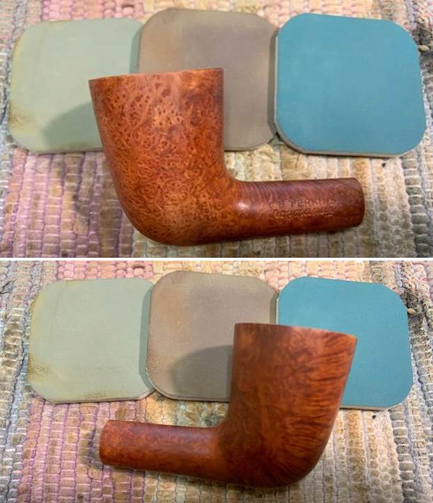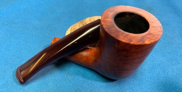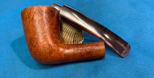 I started my work on this pipe by reaming the bowl. I reamed it with a PipNet Pipe Reamer and took the thin cake back to bare briar. I cleaned up the reaming with a Savinelli Fitsall Pipe Knife. I sanded the walls of the bowl smooth with a piece of dowel and 220 grit sandpaper. I scrubbed the exterior of the bowl with a tooth brush and undiluted Murphy’s Oil Soap. I rinsed it under warm running water to remove the grime and the soap. It is beginning to look good! I scrubbed out the internals of the shank and the stem with pipe cleaners, cotton swabs and isopropyl alcohol. It did not take much to remove the tars and oils. I believe that there was also some stain on the inside of the shank that came out in the process. Both are clean now. I polished the briar with micromesh sanding pads – dry sanding with  1500-12000 grit pads and wiping the bowl down after each pad with a damp cloth. It really is a nice looking piece of briar. I rubbed some Before & After Restoration Balm into the finish of the pipe. I worked it into the briar because the product cleans, enlivens and protects the briar. I let the pipe sit with the Balm for 10 minutes then buffed it off with a soft towel. The Balm did its magic and the pipe looked really good. I set the bowl aside and turned my attention to the stem. I turned my attention to the stem. I polished the stem with micromesh sanding pads – dry sanding with 1500-12000 grit pads. Even though I know that Obsidian Oil is not necessary for acrylic I use it anyway as it gives some bite to the micromesh pads and also removes the dust. I wiped the stem down after each pad with a cloth impregnated with Obsidian Oil. I polished it with Before & After Stem Polish – both Fine and Extra Fine then gave it a final coat of Obsidian Oil and set it aside to dry. This lightly smoked C.B. Perkins Normandy 256 Dublin with a Rose coloured acrylic taper stem looks really good. The grain around the bowl and shank stands out with the contrasting brown stains. I put the pipe back together and buffed the pipe with Blue Diamond on the wheel (being careful of the stamping on the stem so as not to damage that). I gave the bowl and stem multiple coats of carnauba wax and buffed the pipe with a clean buffing pad to raise the shine. I hand buffed it with a microfiber cloth to deepen the shine. The dimensions of this pipe are – Length: 5 ¾ inches, Height: 2 inches, Outside diameter of the bowl: 1 ½ inches, Chamber diameter: ¾ of an inch. The weight of the pipe is 1.45 ounces/41 grams. It is a great looking pipe and one that will be going on the rebornpipes store in the American Pipe Makers section. If you want to add it to your collection let me know via email to slaug@uniserve.com or by message. Thanks for walking through the cleanup with me.