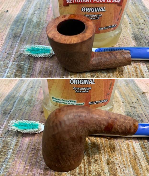 I scrubbed the exterior of the pipe with a tooth brush with undiluted Murphy’s Oil Soap. I scrubbed it to remove the build up on the rim top. I rinsed it with warm water and dried it off with a soft cloth.