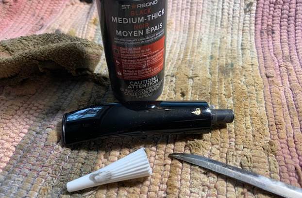I fit a pipe cleaner in the stem and then coated the shaped tenon end with black CA glue and pressed it into the drilled airway in the stem. I set it aside to let the glue harden.