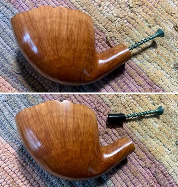 I turned it into the stem and took photos to show the fit in the stem. It looks really good. Still polishing to do at this point as well as gluing the tenon in the stem.