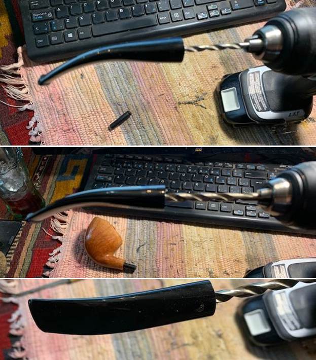 Now it was time to work on replacing the broken tenon. I drilled out the smoothed face of the stem with a cordless drill and a bit roughly the size of the airway in the stem. I find that this helps to center the drilling. I worked my way through 3 drill bits up to 15/64s which is the largest size drill bit that I could safely use on this stem.