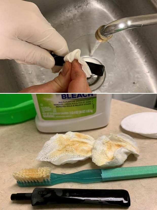 - I wipe down the damaged area with a mix of oxalic acid and water on cotton swabs and pads to get deeply in the grooves. I repeat until I am not getting any coloration on the cotton pads. I wipe it off with a damp cloth.