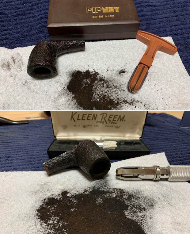 - Ream the bowl and clean it up while carefully paying attention to the rim edges. You do not want to add damage to the shape of the bowl or edges by the reaming. I use a PipNet pipe reamer with four different cutting heads to fit a variety of bowls. I touch up that cleaning with a Savinelli Fitsall Pipe Knife.