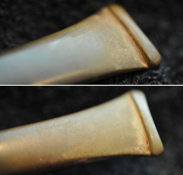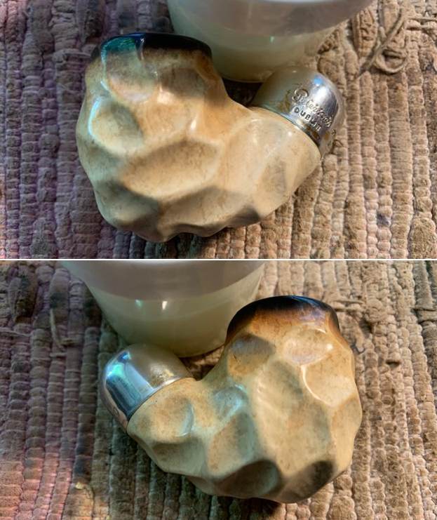 4. Let’s move on to moderate intrusion when the above procedures do not work to address the issues on a plateau/sandblast/rusticated rim top and there is still damage to the inner edge of the bowl. The process below carries on from where you left off in 2 above .