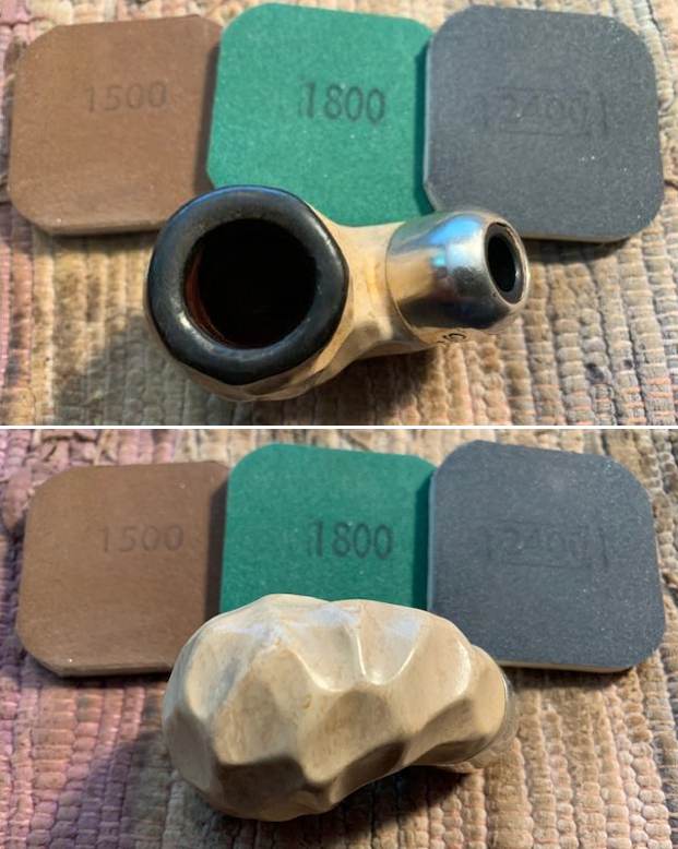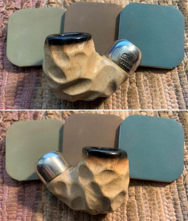 6. Let’s move on to the most intrusive methods when the above procedures do not work to address the issues on a plateau, sandblast or rusticated rim top and there is still damage to the inner edge of the bowl. The process below carries on from where you left off above in 2 and 4. Each of these take slight variations to accommodate the finish.