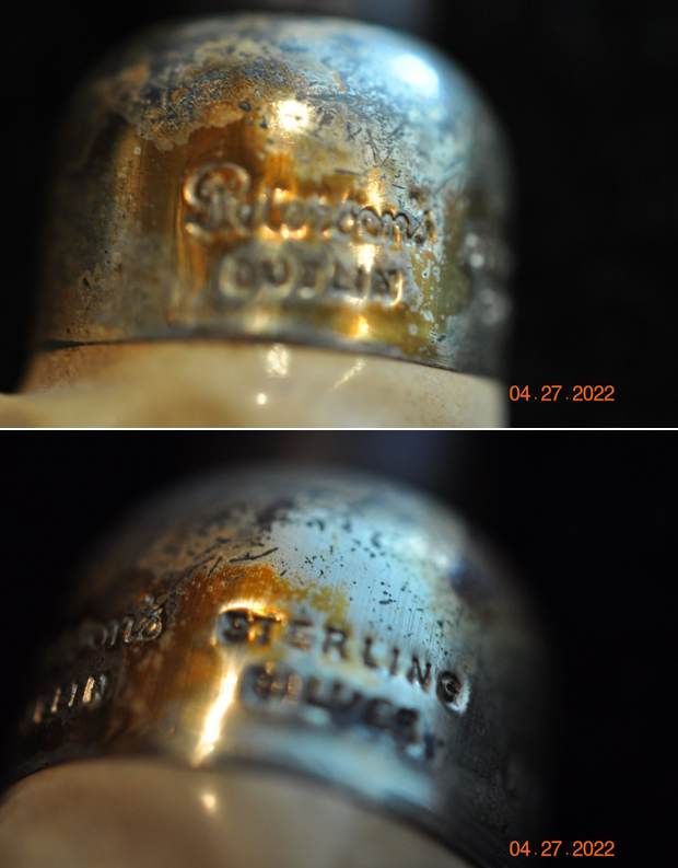 - The rim top has been cleaned and the edges cleaned as noted above. The inner edge of the bowl is out of round and has darkening and burn damage that remains.