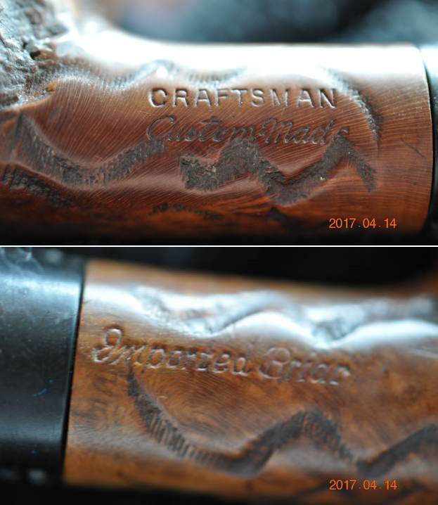 The next pipe on the work table came to us on 04/08/2017 from an antique shop in Stevensville, Montana, USA. The pipe is a classic Custom-Bilt look to it – a rusticated Bullmoose shaped pipe with some deep carving around the bowl. The pipe is stamped on the left side of the shank and reads Craftsman [over] Custom-Made. On the right side it is stamped Imported Briar. There was a lot of grime ground into the smooth and rusticated portions of the finish on the briar. The bowl was heavily caked with a heavy overflow of lava on smooth rim top and inner edge of the rim. The inside edges looked to be in good condition. The outer edge had some marks as well on the right front of the bowl. The stem was dirty and oxidized. There was a cotton fuzz on the saddle portion that was stuck to the vulcanite. It had tooth chatter and marks on the top and underside near the button. There was a remnant of a star shaped logo on the left side of the saddle stem. It had promise but it was very dirty. Jeff took some photos of the pipe before he started his cleanup work.