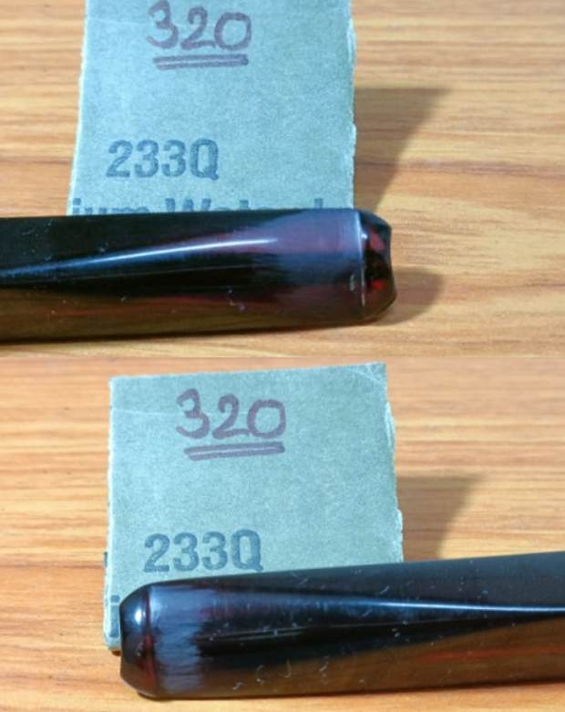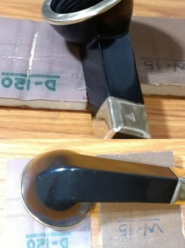 I started this project by reaming the chamber with my smaller fabricated knife and scraped out all the carbon from chamber. I used a 220 grit sand paper, pinched between my thumb and forefinger, to sand the inner walls of the chamber of the pipe. Once I had reached the bare walls, I wiped the chamber with a cotton pad dipped in isopropyl alcohol. This removed all the residual carbon dust and also rid the chamber of all ghost smells. The walls of the chamber are nice and solid with no signs of cracks.I cleaned the external surface of the Meerschaum cup with Murphy’s Oil soap and cotton swabs. I also cleaned the threads at the foot of the cup with tooth brush and oil soap. I wiped the bowl surface with a moist cloth to remove the soap and grime that remained on the surface. The stummel surface cleaned up nicely. The scratches and dents and dings over the stummel surface are now clearly visible.Once I was done with cleaning the external surface of the meerschaum cup, I handed over the cup to Abha, my wife, to work her magic in polishing the cup. She polished the rim top surface and rim edges with micromesh pads. She then went on to dry sand the entire stummel with 1500-12000 grit pads and wiped the bowl down with a damp cloth to remove the dust that was left behind by the sanding. I had requested her to minimize the scratches but not necessarily remove them. These lacerations and dings must have had a history and I wanted to preserve it. She did a fantastic job of polishing the meerschaum cup to a nice deep shine.While Abha was busy with polishing the meerschaum bowl, I addressed the stem repairs. I first cleaned the stem surface and the stem airway using anti-oil dish cleaning soap and thin shank brush and rinsed it under warm running water to remove the entire gunk from the airway. I also cleaned up the threaded tenon with a tooth brush and soap. To finish the cleaning, I ran a few bristled and regular pipe cleaners dipped in alcohol to remove the residual gunk from the airway and dry it out.To address the minor tooth chatter on both upper and lower surfaces, I sand the bite zone with a folded piece of 320 grit sandpaper. However, there was one tooth indentation in the bite zone and the chipped corner of the lip still remained an eyesore. I spot filled these with clear CA superglue and set the stem aside for the glue to cure. I cleaned the mortise by scraping out the dried gunk using my fabricated tool. Next, I cleaned the Bakelite shank with anti oil dish soap and tooth brush. I cleaned the shank internals and mortise with shank brush and anti oil soap and rinsed it under warm water. The shank is now clean both from the inside and the outside. Once the stem fills had cured, I sand the fills with a flat head needle file to roughly match the fill with the rest of the stem surface. I further fine tune the match by sanding the bite zone with 320 grit sandpaper followed by 600 grit sandpaper.  Following the sanding with a piece of 600 grit sandpaper, I began the process of polishing by wet sanding the entire stem with 800, 1000, 1500 and 2000 grit sandpapers. I completed the polishing of the stem by dry sanding the stem with 3200 to 12000 grit micromesh pads. The translucent red of the Redmanol stem just shines through.   With the Meerschaum bowl and the Redmanol stem polished, I turned my attention to the Bakelite shank. I polished the shank by wet sanding with 1500 to 2400 followed by dry sanding with 3200 to 12000 grit micromesh pads. Next I gave a beeswax polish to the meerschaum bowl. I assembled the equipment and materials that would be needed during the process viz heat gun, paper towels, q-tips and a Katori, a steel container graciously lent by Abha from the kitchen and of course, beeswax. I stuffed the chamber with cork to prevent inadvertent seepage of the melted beeswax into either. Next, I melted a sufficient quantity of beeswax in the katori using my heat gun and thereafter heated the stummel. Using the a folded pipe cleaner, I completely coated the stummel with the wax and continued the application till the surface was saturated and set the stummel aside to absorb the wax. I reheated the stummel with the heat gun about 20 minutes later and let the excess wax either be absorbed or drip off from the stummel surface. I rubbed off the excess wax with a soft cotton cloth and brought a deep shine to the surface with a microfiber cloth. To finish, I re-attach the Redmanol stem with the Bakelite shank. I mount a cotton cloth buffing wheel on to my hand held rotary tool and setting the speed at 50% RPM, applied Blue Diamond compound over the shank and the stem surface. I wiped/ buffed the parts with a soft cotton cloth to clear it of any leftover compound dust. I then mounted another cotton cloth wheel on to the polishing machine and applied several coats of carnauba wax over the shank and the stem of the pipe. I finished the restoration by giving the pipe a rigorous hand buffing using a microfiber cloth to raise the shine further. Have a look at the completed pipe below. P.S. – Readers must have noticed that the meerschaum bowl has been changed from three holed one to one hole. Well, if you recollect I had made a mention of draw on this pipe being constricted. It turns out that the meerschaum bowl on this pipe was a long neck one and the one on the bent bulldog had a shorter neck. The Bakelite base of the straight pipe is shallow as compared to the bent bulldog and accommodated the short neck meerschaum bowl better than the long neck bowl. Once the switch was made, the draw on both the pipes was open, full and smooth as silk.
