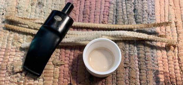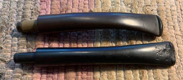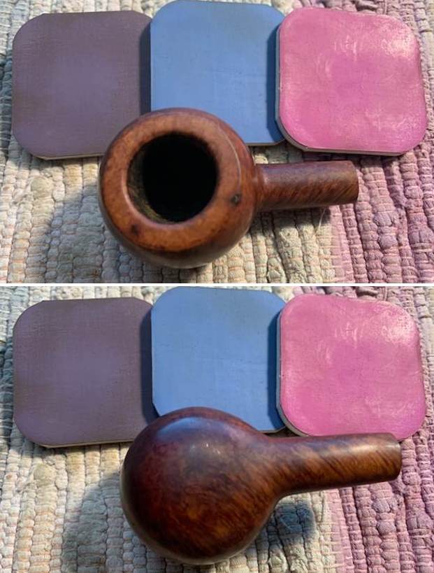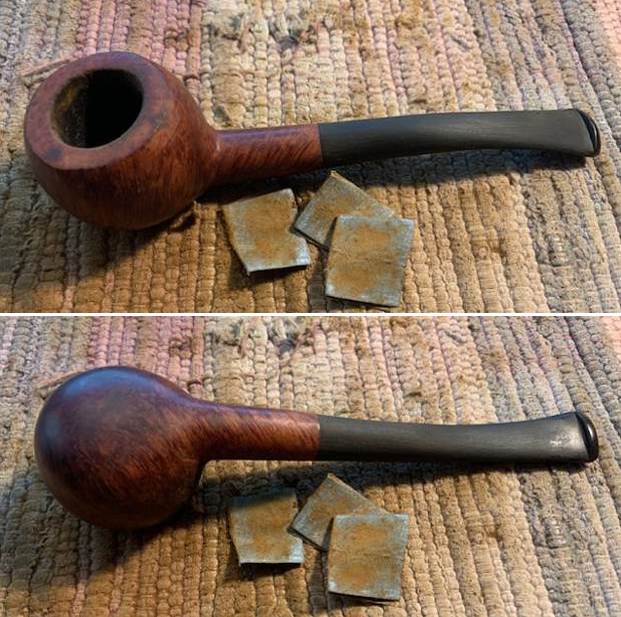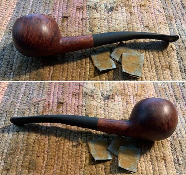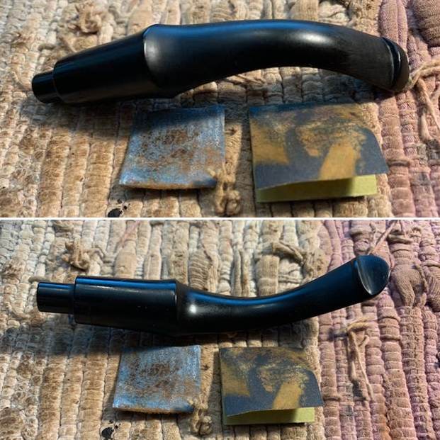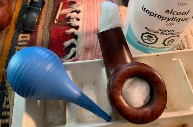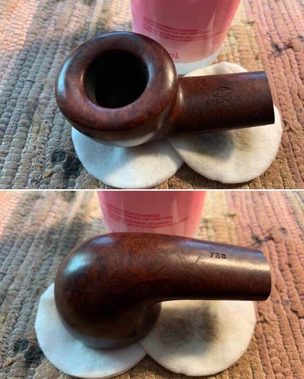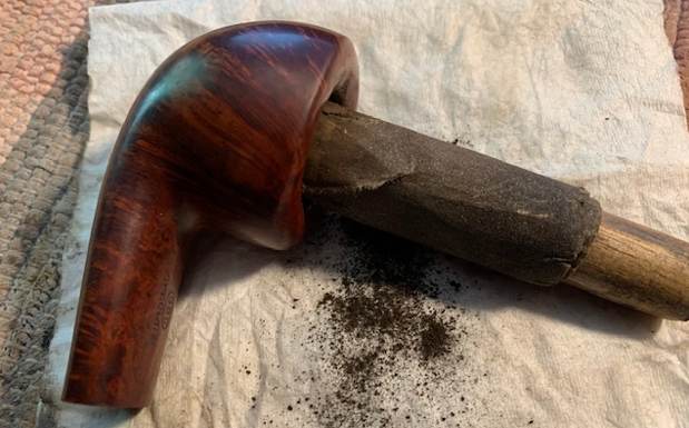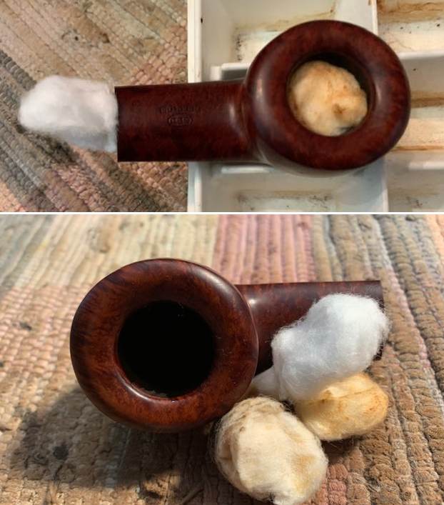 I decided to deghost the bowl and stuffed with cotton bolls and twisted a paper towel into the shank end. I used an ear syringe to fill the bowl with 99% isopropyl alcohol to wick out the oils in the bowl and shank walls. I let it sit for 5 hours and worked on the stem and took my wife to lunch. When we came back the cotton had turned amber coloured. I pulled it out and cleaned out the shank once more. The pipe smelled significantly better.