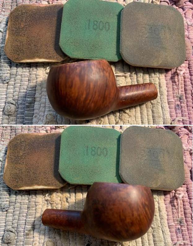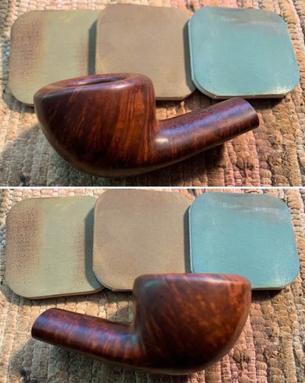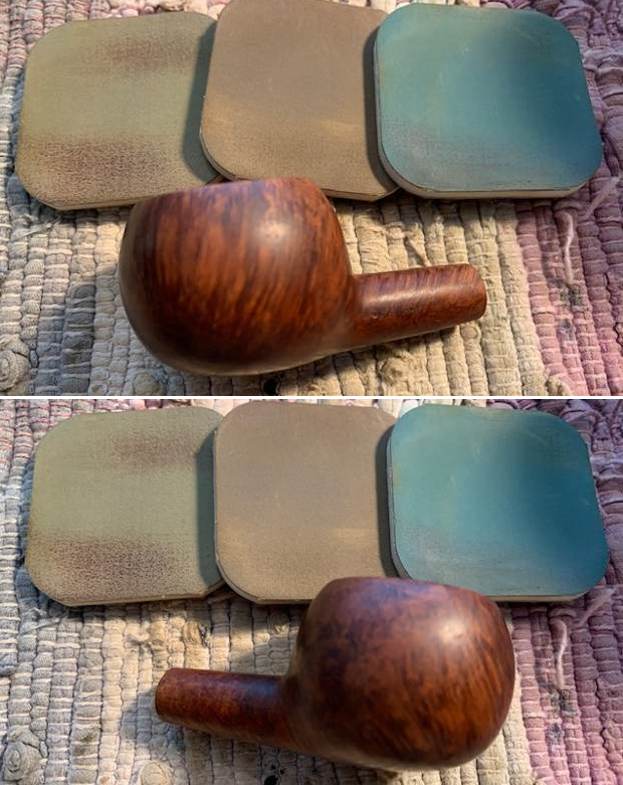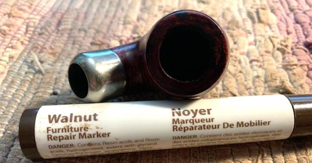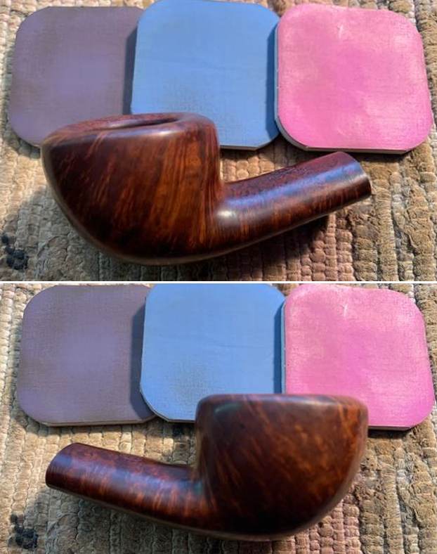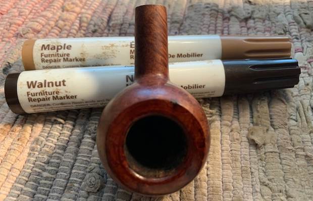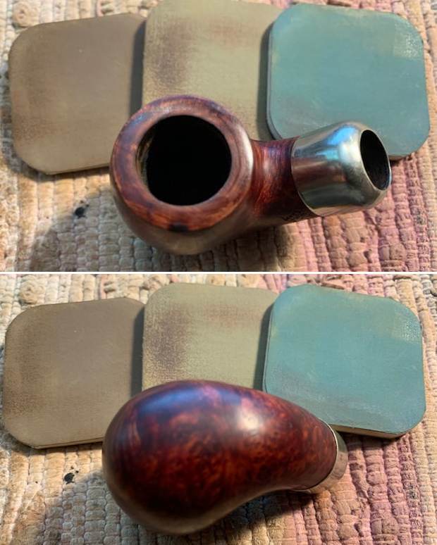 I rubbed the bowl down with Before & After Restoration Balm. I worked it into the surface of the briar with my fingertips where it works to clean, restore and preserve the briar. I let it do its magic for 15 minutes then buffed it off with a cotton cloth. The pipe looks incredibly good at this point in the process.