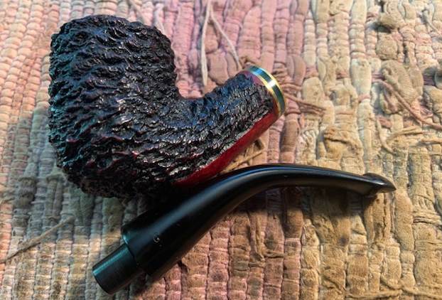 Emerald (1987-) Moderate-priced  line in Bordeaux and black rustic finish with a shank band of green acrylic between brass rings, P-lip mouthpiece; smooth walnut version added in ’91. Fishtail mouthpiece added in ’97. Identical line and finishes named Jade from early eighties until ’87.