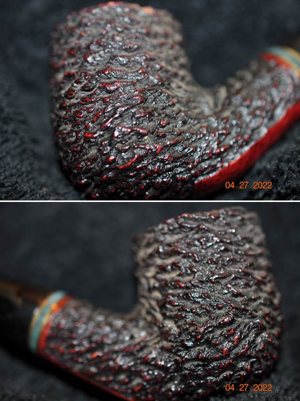 Jeff had done a great job cleaning up the pipe as usual. He reamed the pipe with a PipNet reamer and cut back the cake back to the bare briar. He cleaned up the walls with a Savinelli Fitsall Pipe Knife. He scrubbed the interior of the bowl and shank with pipe cleaners, cotton swabs and alcohol to remove the tars and oils. He scrubbed the exterior of the pipe with Murphy’s Oil Soap and a tooth brush to remove the grime from the finish. He worked on the rim top lava with the soap and tooth brush. He scrubbed the inside of the stem with alcohol and pipe cleaners. He scrubbed the exterior with Soft Scrub and then soaked it in Briarville’s Deoxidizer. He rinsed it off with warm water to remove the Deoxidizer. It looked very good when I brought it to the worktable. I took close up photos of the rim top and the stem surface. I wanted to show how well it had cleaned up. The rim top looked very good. The beveled inner edge had some darkening that would need to be cleaned up in the next steps of the process. I took photos of the stem to show the tooth marks on the surface ahead of the button and on the sharp edge of the button itself. I took a photo of the stamping on the underside of the shank. You can see that it is stamped as noted above. It is clear and readable. I took the pipe apart and took a photo of the pipe. It is a good looking pipe and has a rugged rustication around the bowl and shank.I began my work on the pipe by dealing with the beveled inner edge of the bowl. I used a folded piece of 220 grit sandpaper to smooth it our and lessen the darkening. It cleaned up well and looked very good.The front portion of the rim top had been slightly smoothed out from use so I used a series of burrs on my Dremel to recut the rustication on that portion. I was able to match it pretty well with the remaining rustication on the rim top. I used a brass bristle wire brush to knock off the high spots. I restained the rim top and edge in that area with a Mahogany and Walnut stain pen. The combination of the colours looked very good. I worked some Before & After Restoration Balm into the surface of the briar with my fingertips and a horsehair shoe brush to clean, enliven and protect the briar. I let the balm sit for 15 minutes and then buffed with a cotton cloth to raise the shine. The photos show the bowl at this point in the restoration process. I set the bowl aside and worked on the stem. I sanded out the tooth marks and gouges in the surface and reshaped the button edges with 200 grit sandpaper. I started the polishing with 400 grit wet dry sandpaper.I polished the stem with micromesh sanding pads – wet sanding with 1500-12000 grit sanding pads. I wiped it down after each sanding pad with Obsidian Oil. I polished it with Before & After Pipe Stem Polish – both Fine and Extra Fine. I touched up the “P” stamp on the top of the stem with Gold Acrylic Nail Polish. I worked it into the stamp with a tooth pick and wiped off the excess. There was not enough of a stamp to hold the gold stamp in place. It is faint enough that without a lens it cannot be seen. I am excited to finish this Republic Era Peterson’s Emerald 01 Bent Billiard. I put the pipe back together and buffed it with Blue Diamond on the buffing wheel. I gave the bowl multiple coats of Conservator’s Wax and the stem multiple coats of carnauba wax. I buffed the pipe with a clean buffing pad to raise the shine and hand buffed it with a microfibre cloth to deepen the shine. It is fun to see what the polished bowl looks like with the rugged rustication all around it. Added to that the polished triple brass and emerald acrylic band and the black vulcanite stem was beautiful. This Classic Peterson’s Emerald is nice looking and the pipe feels great in my hand. It is light and well balanced. Have a look at it with the photos below. The dimensions are Length: 5 ½ inches, Height: 1 ¾ inches, Outside diameter of the bowl: 1 ¼ inches, Chamber diameter: ¾ of an inch. The weight of the pipe is 47 grams/1.66 ounces. It is a beautiful pipe and one that will be on the Irish Pipe Makers Section of the rebornpipes store soon. If you are interested in adding it to your collection let me know. Thanks for walking through the restoration with me as I worked over this pipe. Thanks to each of you who are reading this blog.