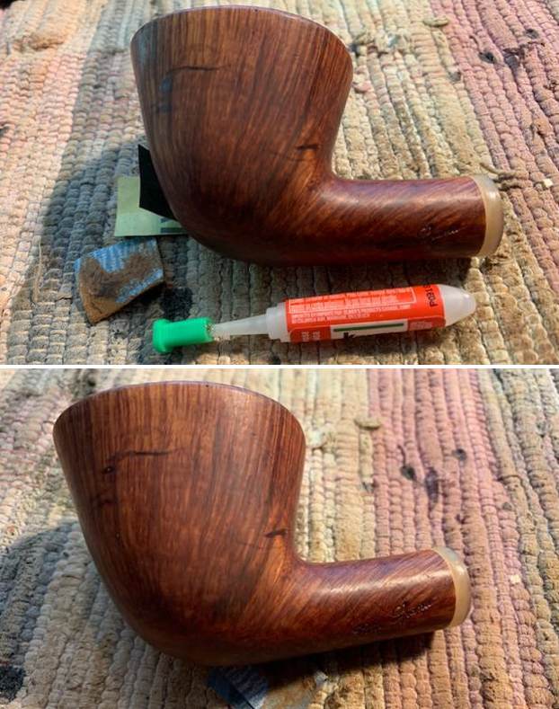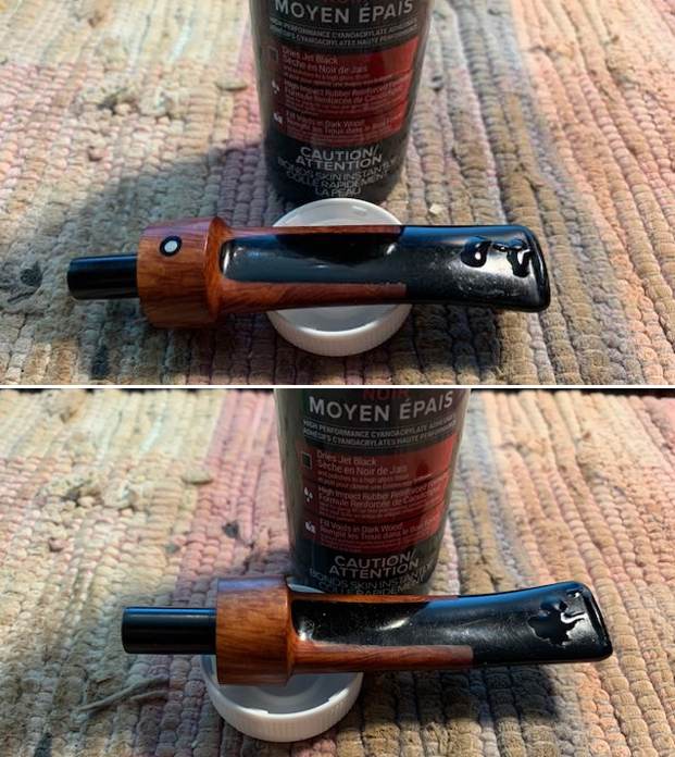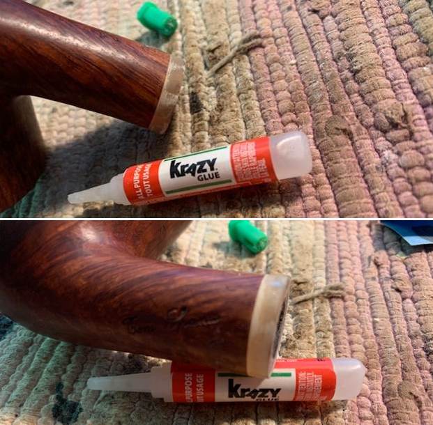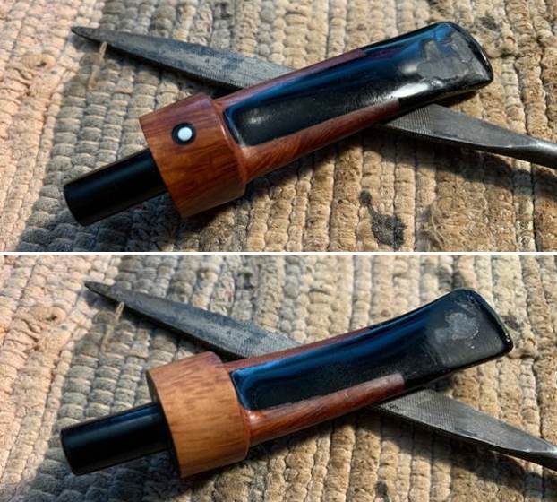 I began my work on the pipe by dealing with worm holes in the horn shank band. I filled them in with clear super glue. I repeated the fill until the surface was smooth. I blended the repairs into the surrounding horn and it looked good. I put the stem on the shank and sanded the junction as well.