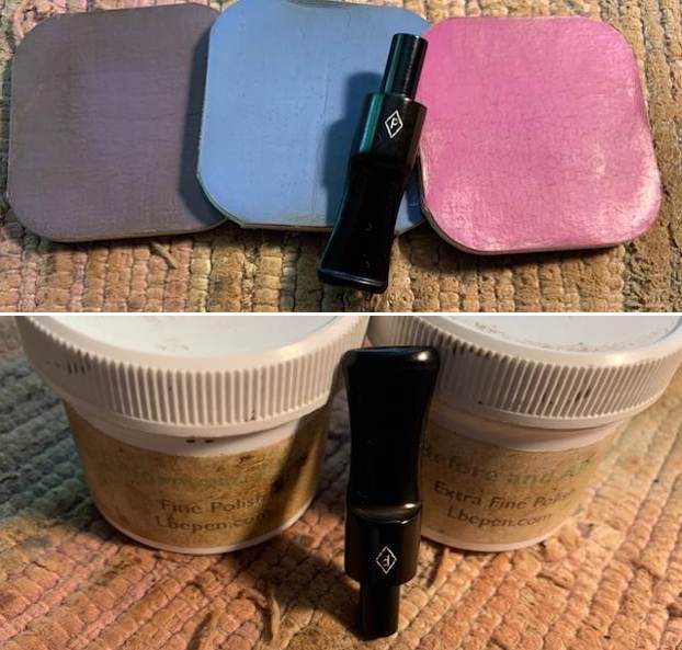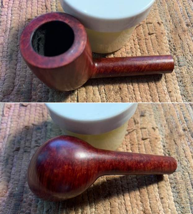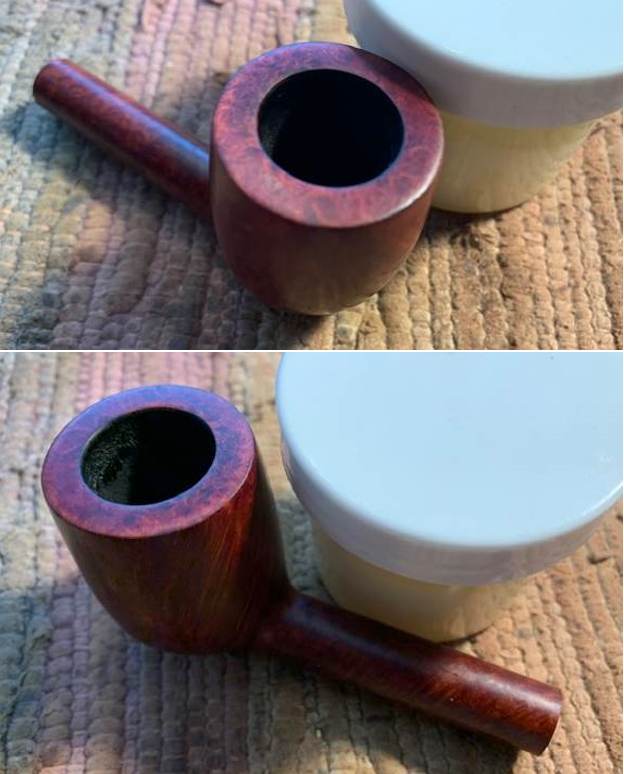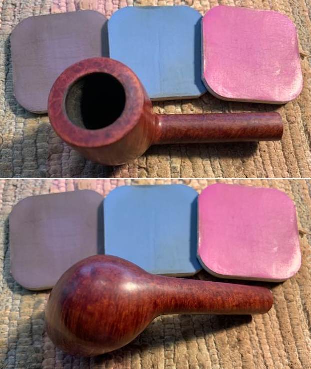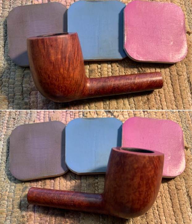 Jeff cleaned the Parker up really well. He reamed it with a Pipnet Reamer and cleaned up the reaming with a Savinelli Fitsall pipe knife.  He had scrubbed the exterior of the bowl with Murphy’s Oil Soap and a tooth brush and rinsed it off with warm water to remove the grime from the finish. He cleaned the internals of the shank and stem with alcohol, cotton swabs and pipe cleaners to remove the tarry residue and oils from the airway in the shank and stem. He soaked the stem in Before & After Deoxidizer to remove the oxidation on the stem surface. When it arrived here on my work table I took photos of the pipe before I started my part of the restoration. The pipe looked very good with a light oxidation still remaining on the stem surface. The Diamond P stamp was clean but had no colour left in the stamping.   The inner and outer edges were in good condition. There was some darkening on the back of the rim top and around the inner edge. There was some light marks or nicks on the front edge. The stem looked good but there was still some oxidation and there were tooth marks and chatter on both sides near the button. I took a photo of the stamping on the sides of the shank. The stamping is clear and readable and reads as noted above.  I took the stem off the pipe and took a photo of the parts to show the look of the pipe as a whole. I started my work on the inner edge of the bowl and rim top with a folded piece of sandpaper to clean up the darkening and damage. It looked much better after the work.   I polished the rim top and bowl with 1500-12000 grit micromesh sanding pads to polish the briar. I wiped it down with a damp cloth after each sanding pad.   I rubbed the bowl and shank down with Before & After Restoration Balm. I worked it into the surface of the bowl sides and shank with my fingertips to clean, enliven and protect the briar. I let the balm sit for 15 minutes then buffed with a cotton cloth to raise the shine. You can see the grain showing through the deep glow. I “painted” the stem surface with the flame of a Bic lighter. I was able to lift the dents and then sanded out the remnants of chatter and marks with 220 grit sandpaper. I started polishing the stem with 400 grit wet dry sandpaper.      I touched up the Diamond P stamp with White Acrylic Fingernail Polish. I pushed it into the stamping with a tooth pick. I scraped it off with the tooth pipe and a cotton pad to remove the excess and still leave some in the stamping.  Afterwards I used a 1500 grit micromesh sanding pad to remove the remaining acrylic.    I polished the vulcanite stem with micromesh sanding pads – 1500-12000 grit pads. I wiped it down with cloth impregnated with Obsidian Oil after each sanding pad.    This 1953 Parker British Made Super Bruyere 68F Lovat is a great looking pipe now that it has been restored. The medium reddish brown stain highlights the grain and works well with the polished vulcanite bent taper stem. I put the stem back on the bowl and carefully buffed the pipe with Blue Diamond on the buffing wheel using a light touch on the briar. I gave the bowl and the stem multiple coats of carnauba wax on the buffing wheel and followed that by buffing the entire pipe with a clean buffing pad. I hand buffed the pipe with a microfiber cloth to deepen the shine. The finished Lovat fits nicely in the hand and feels great. Give the finished pipe a look in the photos below. The dimensions of the pipe are; Length: 5 inches, Height: 1 ¾ inches, Outer diameter of the bowl: 1 ¼ inches, Chamber diameter: ¾ inches. The weight of the pipe is 1.20 ounces/34 grams. I will be adding it to the rebornpipes store in the British Pipemakers Section. Thanks for reading this blog and my reflections on the pipe while I worked on it. This is an interesting estate to bring back to life.