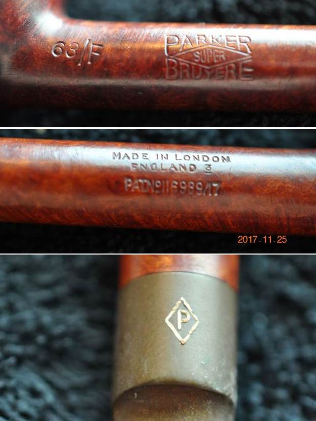 The next pipe on the work table was purchased on 08/16/17 from the same estate in Portland, Oregon, USA as the other Parker I worked on. This one is a beautiful little Parker Lovat. The stamping on the left side of the shank reads Parker over Super in a diamond over Bruyere. To the left of that next to the shank bowl junction is the shape number 63/F. On the right side of the shank the stamping reads Made in London over England with an underlined superscript 3 following the D in England that is the date stamp 1953. The date stamp was easily read after the previous 1954 Parker Super Bruyere Cherrywood that I restored and added to my collection (https://rebornpipes.com/2022/07/16/restoring-my-birth-year-1954-parker-super-bruyere-patent-cherrywood-281-f/). Further stamping under that reads PAT NO. 116989/17 which should also help with dating the pipe. The finish on the pipe was filthy with grime ground into the briar. There was a thick cake in the bowl that flowed out on top of the crowned rim top and down the outer edge of the rim. The cake was thick so it was hard to know what the edge of the rim looked like. The stem was heavily oxidized and calcified with tooth marks on the top and underside ahead of the button. There was a Diamond P logo on the top of the stem. Jeff took photos of the pipe before he cleaned it up. He took photos of the bowl and rim top to show the condition of the pipe. You can see the cake in the bowl and the thick lava build up on the inner edge and the rim top. The stem photos show the oxidation and tooth marks and chatter on the top and underside ahead of the button. He took photos of the bowl and the heel to capture a sense of the grain around the bowl. It is a really nice piece of briar.   He took photos of the stamping on sides of the shank as well as the logo stamp on the top side of the saddle stem. All are clear and readable as noted above.    I have worked on quite a few Parkers over time but this is the second one stamped with both a date stamp and a Patent number. The superscript 3 after the D in England and a Patent Number under that. The pipe was a 1953. I found a picture of a pipe that had the same stamping on both sides of the shank as the one I am working on but it has a different shape number and date after the D (http://www.pipephil.eu/logos/en/logo-parker.html). I have included a screen capture of the section showing pipe. At the top of the listing there was a short summary of the history of the brand. I quote from it below.