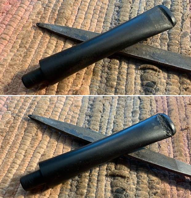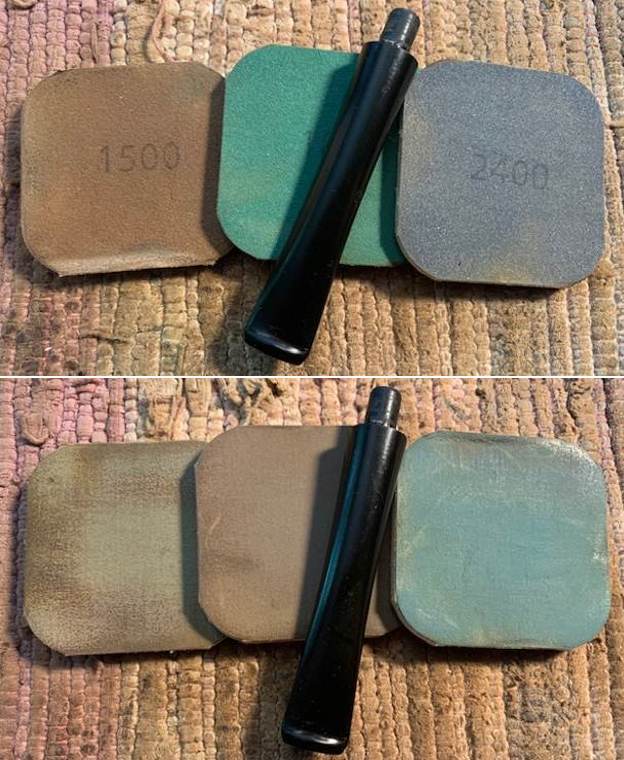 I used a lighter to “paint” the deep marks on both sides of the stem near the button. I was able to lift them a bit but not significantly, I filled in what remained with black super glue and flattened the repair with a dental spatula. Once it cured I used a small file to redefine the button edge. I used a folded piece of 220 grit sandpaper to blend the repairs into the surface of the stem. I started polishing the stem with a folded piece of 400 grit sandpaper. I wiped the stem down with Obsidian Oil.
