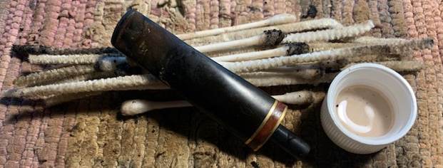 To rid the bowl of the tars and oils that made the bowl still stink I stuffed it with cotton bolls and twisted a boll into a wick that I threaded into the shank. I used an ear syringe to fill the bowl with isopropyl alcohol and set it in an old ice tray over night to let it wick out the tars and oils.