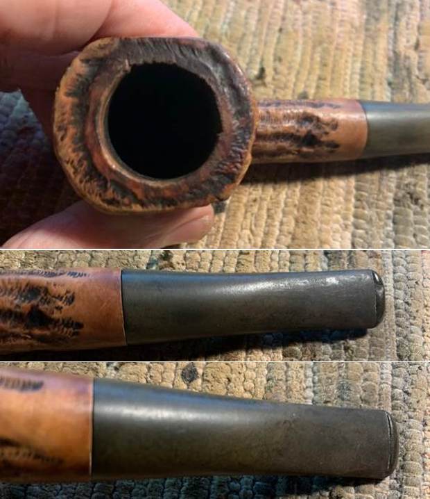 He took photos of the rim top and bowl to give a clear picture of the thickness of the cake and tobacco debris as well as the lava on the smooth rim top. He also took photos of the top and underside of the stem to show the oxidation and the chatter and tooth marks.