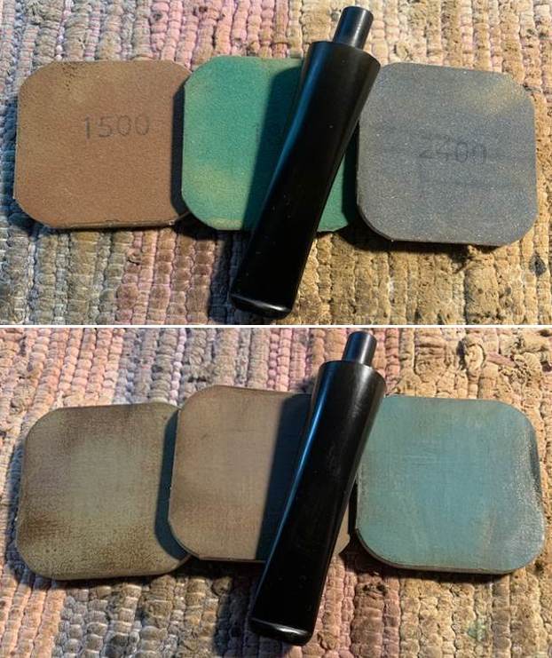 I sanded the button edges and the repairs on the stem with 220 grit sandpaper to blend them into the surface of the vulcanite. I started polishing it with 400 grit wet dry sandpaper.