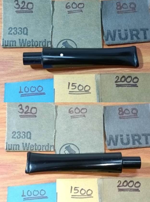 Once the fills had cured nicely, I moved ahead and began the process of filing and shaping the button end with a flat head needle file followed by further sanding the repair with a piece of 220 grit sandpaper. To achieve a better blending of the repaired surface with rest of the stem as well as to polish the stem, I dry sanded the entire stem with 320, 600 and 800 grit sand papers followed by wet sanding using 1000, 1500 and 2000 grit sand papers. This progressive use of higher grit sandpapers helps to reduce the sanding marks left behind by the more abrasive ones while completely eliminating the oxidation and imparting a clean shine to the stem surface.