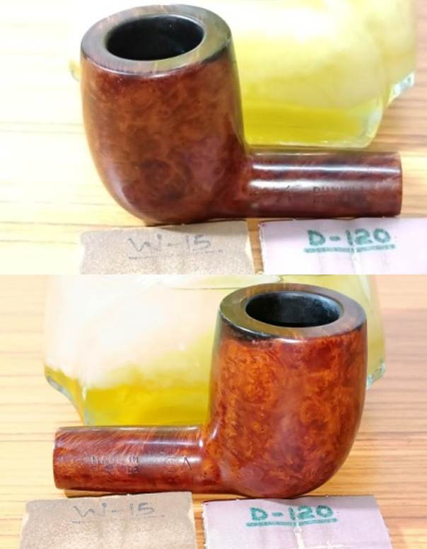 One of my friends here is an avid collector of pipes and he expressed a desire to expand his collection restricted only to English made pipes. He wanted a Dunhill with crisp stampings (that is always a challenge!) and so began my hunt for one. I found one on eBay Germany, which had a seriously damaged rim edge but otherwise in great condition for a 61 year old pipe. I discussed this piece with my friend and soon the pipe made its way to India and is now on my work table. It’s a classic Billiard with a fishtail stem and a flat bottom that makes it a sitter. The briar is flawless and without any fills or imperfections as expected from Dunhill. The pipe is stamped on the left near the bowl and shank junction as “59” followed by “F/T” followed by “DUNHILL” over “BRUYERE”, all in capital letters, towards the shank end. The right side of the shank is stamped as “MADE IN” over “ENGLAND” with suffix 1 after letter D and followed by an encircled “4” and letter “A”. The upper surface of the stem bears the trademark White Dot of the brand.