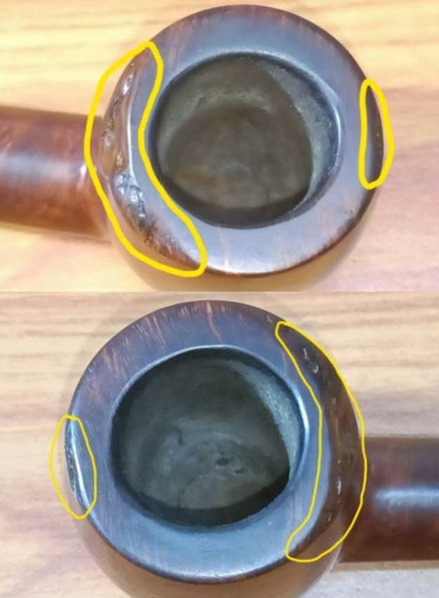 The chamber appears to have been reamed before the pipe was designated for sale by the previous owner and thus the chamber is devoid of any cake. All that remains is some dust and fine carbon particle accumulation along the walls of the chamber. The rim top is darkened but without any overflowing carbon. However, it’s all together a different ball game when it comes to the rim edges. The most significant damage is to the aft outer rim edge where a large chunk of briar has chipped away, most likely the result of a fall from some height. Similarly, the front of the rim outer edge too has a small chunk of briar missing and appears to be the result of knocking against a hard edge. Both these damages are encircled in yellow. The inner rim edge shows signs of charring in the 6 o’clock and 12 o’clock directions. These areas have been encircled in red. The chamber odor is light but present and would need to be completely eliminated.