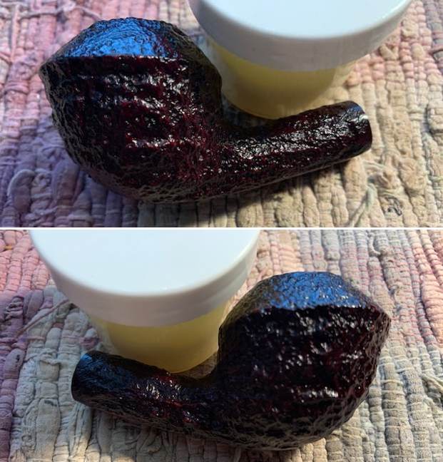 I put the Bill Ashton made Romford Rhodesian back together and buffed the bowl and stem with Blue Diamond on the buffing wheel. I polished out the tiny scratches remaining in the acrylic and used a light touch to polish the sandblast finish. The bowl and stem looked very good. I gave the bowl several coats of Conservator’s Wax and the stem multiple coats of carnauba with the wheel. I buffed it with a clean wheel on the buffer and hand buffed it with a soft cloth to deepen the shine. The finished pipe looks very good. The rugged sandblast finish highlights the grain that is below it and really is a stunning pipe. The pipe feels great in the hand. It is comfortable and light weight for its size. The finished Romford is shown in the photos below. The dimensions of the pipe are Length: 6 inches, Height: 1 ¾ inches, Outside diameter of the bowl: 1 ¾ inches, Chamber diameter: ¾ of an inch. The weight of the pipe is 2.05 ounces/ 58 grams. I am still very undecided whether to keep this pipe or part with it. This is the problem of working on so many pipes – which to keep and which to sell. Thanks for reading this blog and my reflections on the pipe while I worked on it.