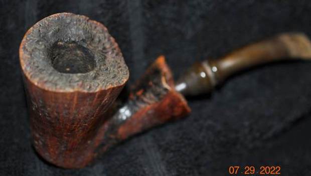 My brother Jeff picked up another Jobey Dansk Freehand pipe on June 6, 2022 from an antique shop in Cannon Beach, Oregon, USA. It had really unique shape and some nice grain with spot carvings around the bowl and shank. There was some plateau on the top of the rim and on the end of the shank. I have worked on enough of these to know that were Danish Freehand pipes were carved by Karl Erik. This one was stamped on the underside of the shank end and read Jobey in script [over] Dansk [over] Handmade in Denmark [over] 2 The finish on this pipe was dirty with dust and lava on the plateau top. The bowl was lined with a thick cake. There was thick dust in the rustication around the bowl and shank as well as the plateau on the shank end. The smooth finish was also dirty and dull looking. The fit of the stem to the shank was snug. It was a fancy turned vulcanite stem that was oxidized and calcified. There were light tooth marks on both sides of the stem at the button and on the smooth parts of the button on both sides. Otherwise it was a very clean stem. Jeff took of the pipe to show the overall condition of the bowl and stem.