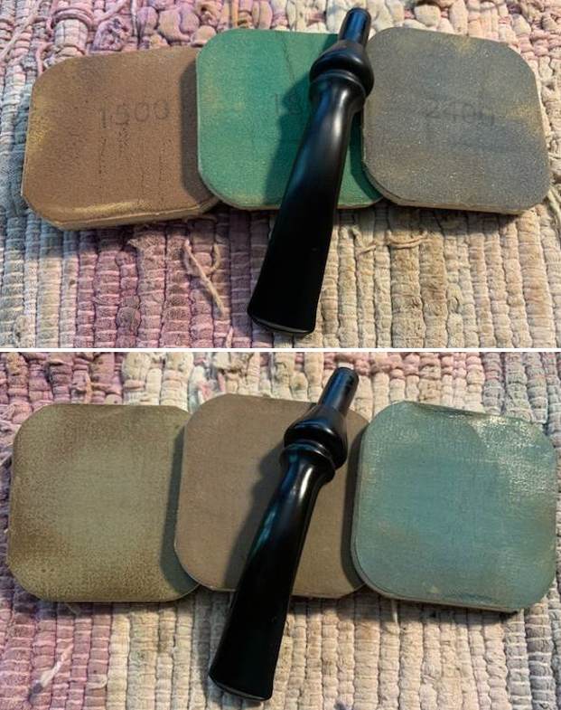 I started my work on the pipe by addressing the darkening and damage to the inner edge of the rim. I used a folded piece of 220 grit sandpaper to work and smooth it out. It looked better when I had finished.