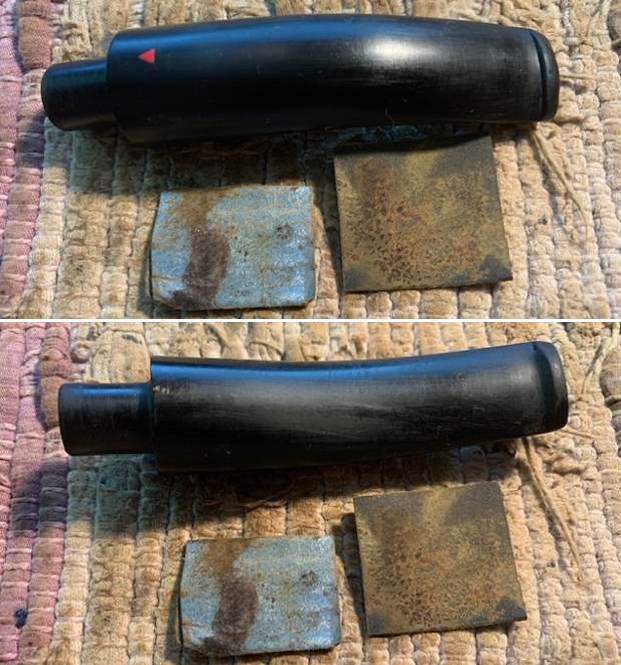 He took photos of the rim top and the stem to show the condition. You can see the thick cake in the bowl and overflow of lava on the rim top. The photos of the stem show the tooth marks and damage in the hard rubber on the top and underside ahead of the button.
