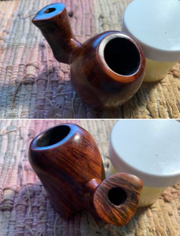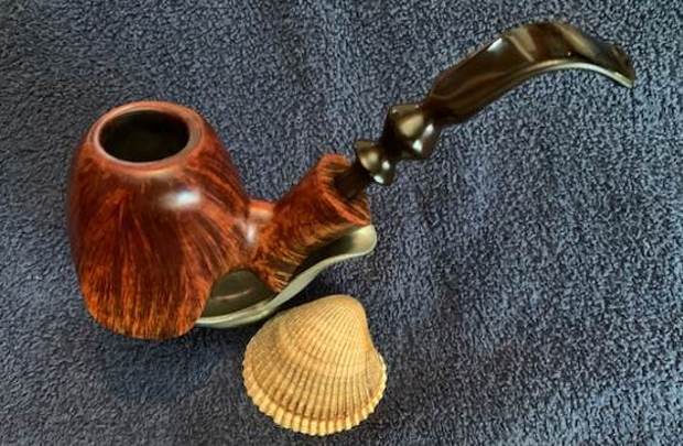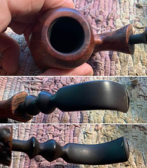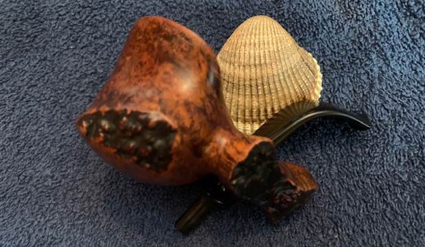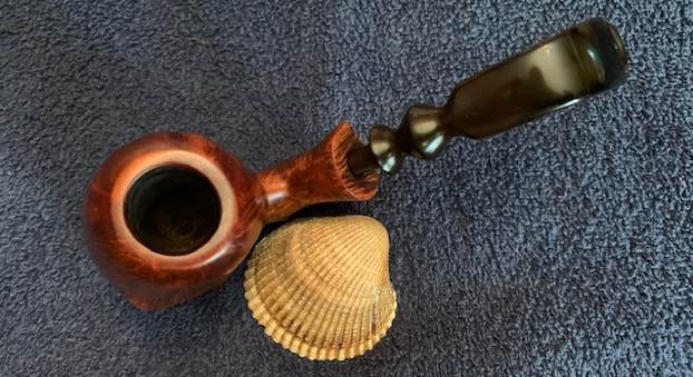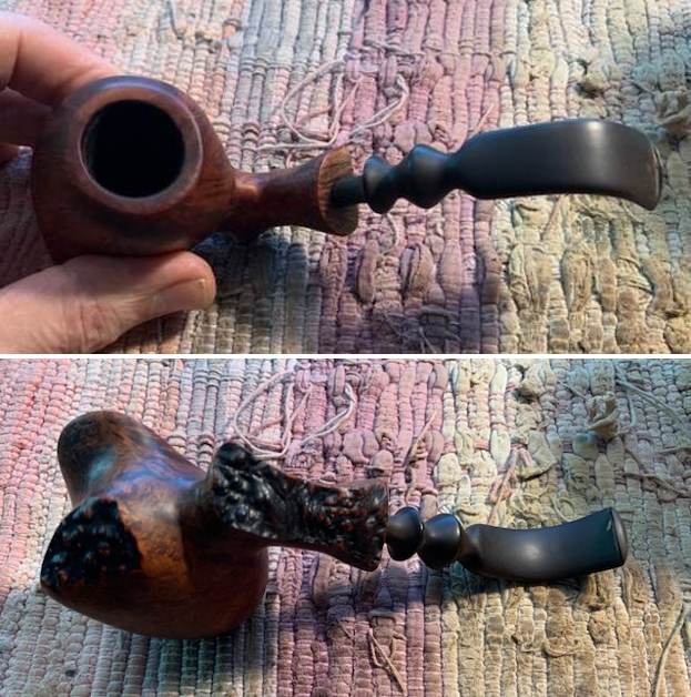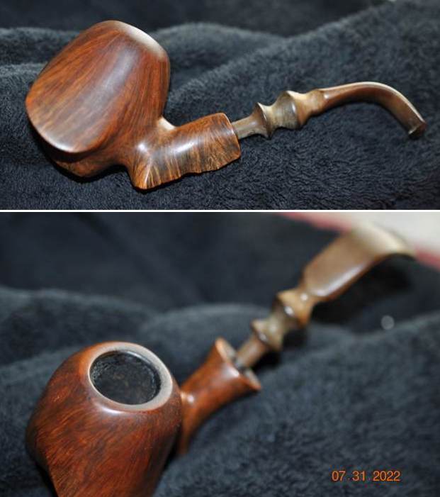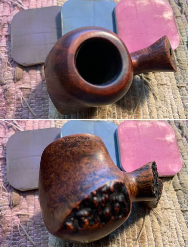 There were also photos that were included on Pipephil of what this particular pipe looked like when it left Denmark. The rustication around the bowl and shank is very similar. The pipe I have does not have a shank extension but otherwise the finish is much the same. The pipe in the photo had a fancy turned vulcanite stem. The stem on the one I have in front of me is the original stem on the pipe and it is a fancy double saddle pearlized acrylic or Lucite stem.