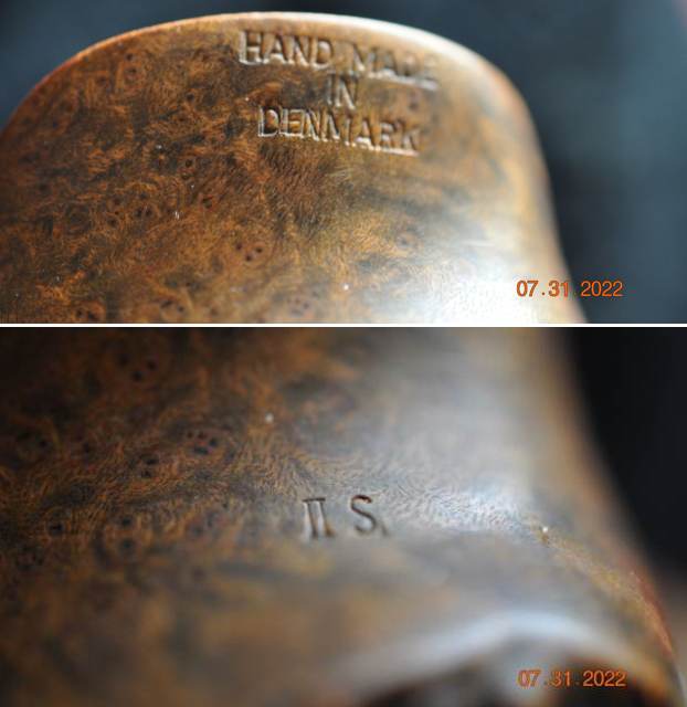 The next pipe on the table was purchased from an estate lot on 06/13/22 from Fort Myers, Florida, USA. It has that verve that I have come to associate with pipe made by Preben Holm and the fellow we purchase this lot from obviously love Preben Holm pipes because we acquired several from him in this lot from the IIS pipes to a Danish Pride still to come. They are unique and beautiful. The pipe is stamped on a smooth panel on the underside. It reads Monte Verde over Made in Denmark by Hand. Underneath that there is a script stamp that reads Twin Finish. I have refurbished several Monte Verde pipe so if you are interested in the brand here is a link to one I did back in 2019 that is very similar to this one (https://rebornpipes.com/2019/02/09/new-life-for-a-preben-holm-monte-verde-twin-finish-freehand/). It was quite dirty, like the rest of the pipes in this collection. There was a thick cake in the bowl and a heavy lava overflow on the rim top that filled in the rustication. The inner and outer edges of the bowl looked very good. The stem had some light tooth marks and chatter on both sides near the button but really was in quite remarkable condition. Jeff took photos of the pipe before he started his cleanup process.