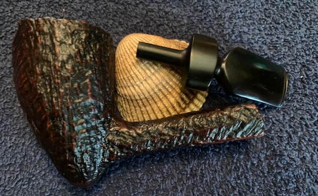 There is something about this strangely beautiful sandblast long shank Freehand says that is it another Preben Holm pipe. The unique shape that really chases the grain to give a sense of vertical and horizontal grain of the sandblast says Holm to me. The style of the stem is a bit of an oddity to me but it is the same width as the shank so it probably is original. This pipe was purchased on 06/13/22 from an estate in Fort Myers, Florida, USA. It is stamped Hand Made [over] In [over] Denmark [over] Westminster [over] IIS. The shape of the bowl with the angles of the carving are unique and the depth of the sandblast give a sense of fluidity to the pipe. The finish is stained with dark colours – black and brown that make it have a depth to its finish. It was filthy and the plateau rim and shank end was the same. The dust and debris is quite heavy around the sides of the bowl. The plateau rim top has a heavy lava overflow on the top and edges coming from a thick cake in the bowl. There is also a crack in the underside of the shank end that extends straight through the stamping. The oddly shaped turned vulcanite stem was heavily oxidized and calcified with light tooth marks and chatter on both sides ahead of the button. When I first saw it I was not even sure if it was the right stem but it is growing on me. Jeff took photos of the pipe before he started working on it. It really is a beauty.