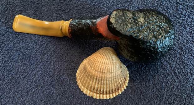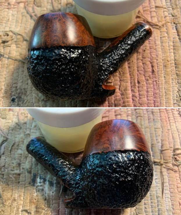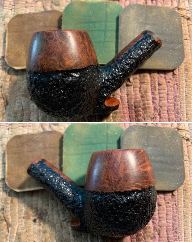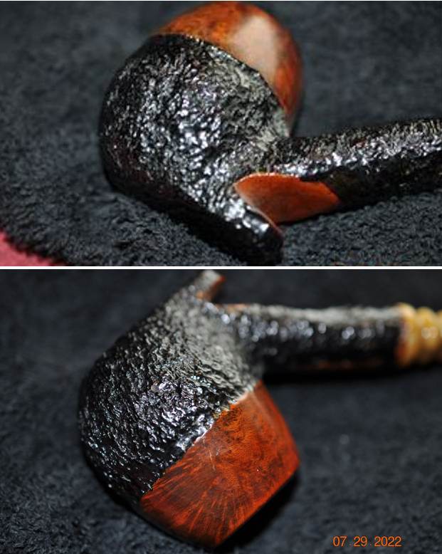 The next pipe on the table was purchased on 05/10/22 from an antique mall in Astoria, Oregon, USA. This unique Jobey has a flat base with a short tail that stabilizes the sitter. It has a rugged, finish that looks like a combination of sandblast and rustication (blastication) with lots of nooks and crannies in the briar. The top of the shank and the upper 1/3 of the bowl are smooth briar. The come together and really are quite beautiful! The pipe is stamped on a smooth panel on the topside of the shank and reads Jobey [over] Designer. The valleys and ridges of the “blasticated” grain showing through the grime and dirt are a mixture that leaves a rich texture. It had rich dark and medium contrasting brown stains that do not look too bad. There was a thick cake in the bowl with remnants of tobacco stuck on the walls. There was a lava overflow on the crowned top of the rim and covering the inner edge. It was hard to know if the rim edges were damaged. It was a beautiful pipe that was dirty and tired looking but there was a thick coat of shiny varnish or shellac covering the whole thing. The stem was golden variegated acrylic that had fancy turnings on the saddle. The tenon was the patented Jobey Link System that was developed to protect the shank. There was a hairline crack on the top of the stem where the tenon fit but it was not open and was very fine. There were tooth marks and chatter on the stem near the button on both sides. There is a brass Jobey oval logo on the top of the stem identifying it as a Jobey pipe. Jeff took photos of the pipe before he cleaned it up.