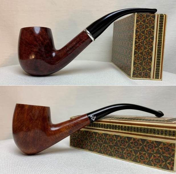 The Designer series combines real craftsmanship with a unique pipe design. This perfectly balanced briar features a smooth walnut finish, complemented by a golden Lucite stem. It sold for $50USD
