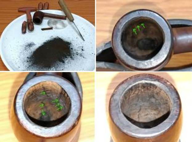 After I had protected the heel and the walls of the chamber with a coat of J B Weld, it was necessary to prevent this coat from coming into contact with the burning tobacco. I addressed this by mixing activated charcoal and plain yogurt to a thicker consistency, just enough that it would spread easily and applied it evenly all along the chamber walls after inserting a folded pipe cleaner through the draught hole to keep it open. Once dry and set, this will not only protect the walls but also aid in faster buildup of cake. I set the bowl aside for the bowl coat to cure for 72 hours.